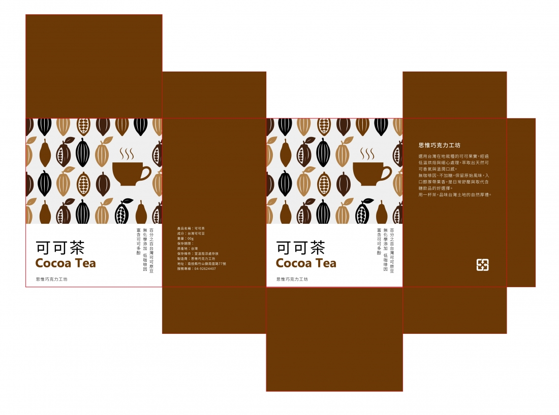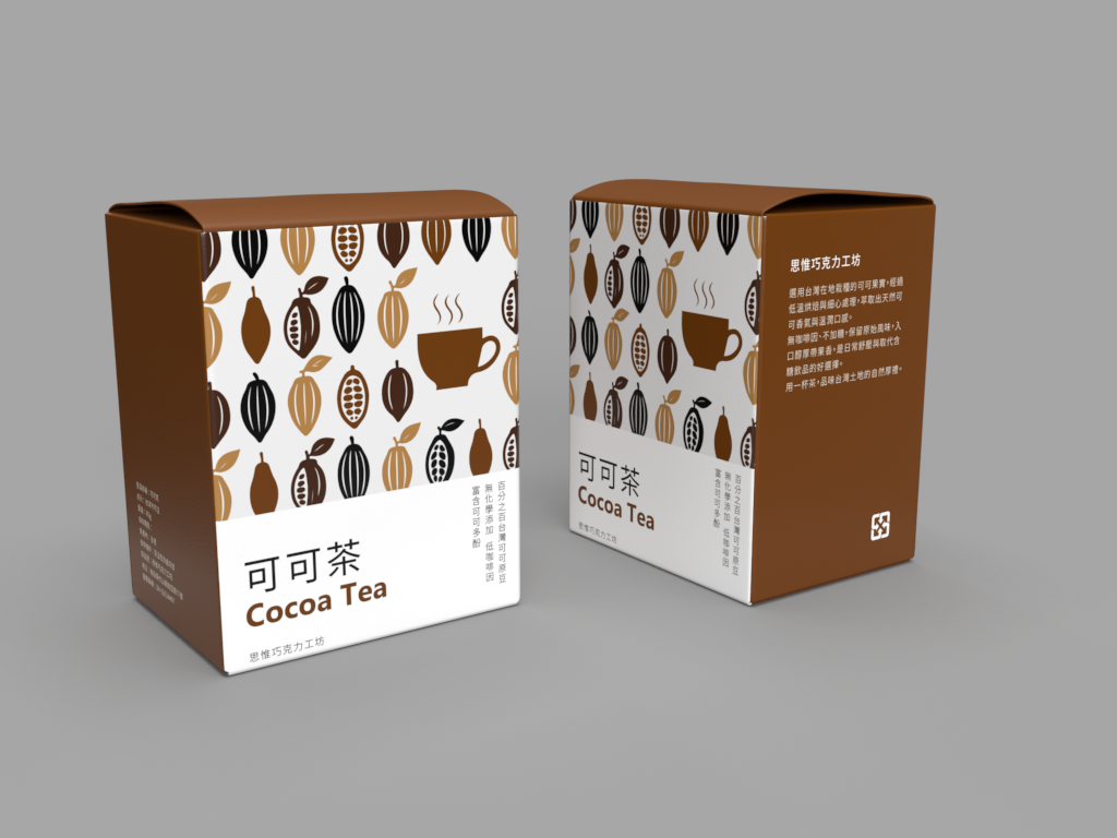 這款可可茶包裝以「自然、純粹、在地」為核心設計概念。 使用深棕與白色調,象徵可可的溫潤與土地的質樸,中段圖紋以可可果實與茶杯意象反覆排列,象徵土地與陽光孕育出的豐饒果實,傳達產品天然且真材實料。整體風格走現代簡約風。希望消費者打開這盒茶,就像走進臺灣可可園,品味大地的風味。