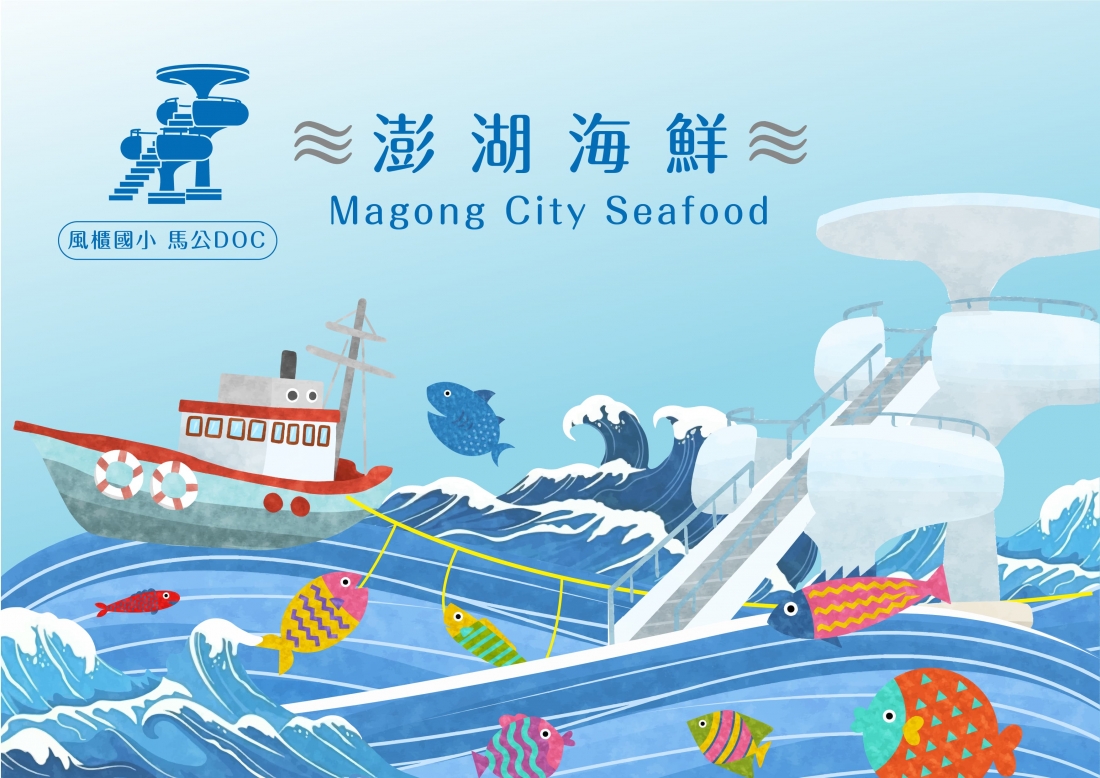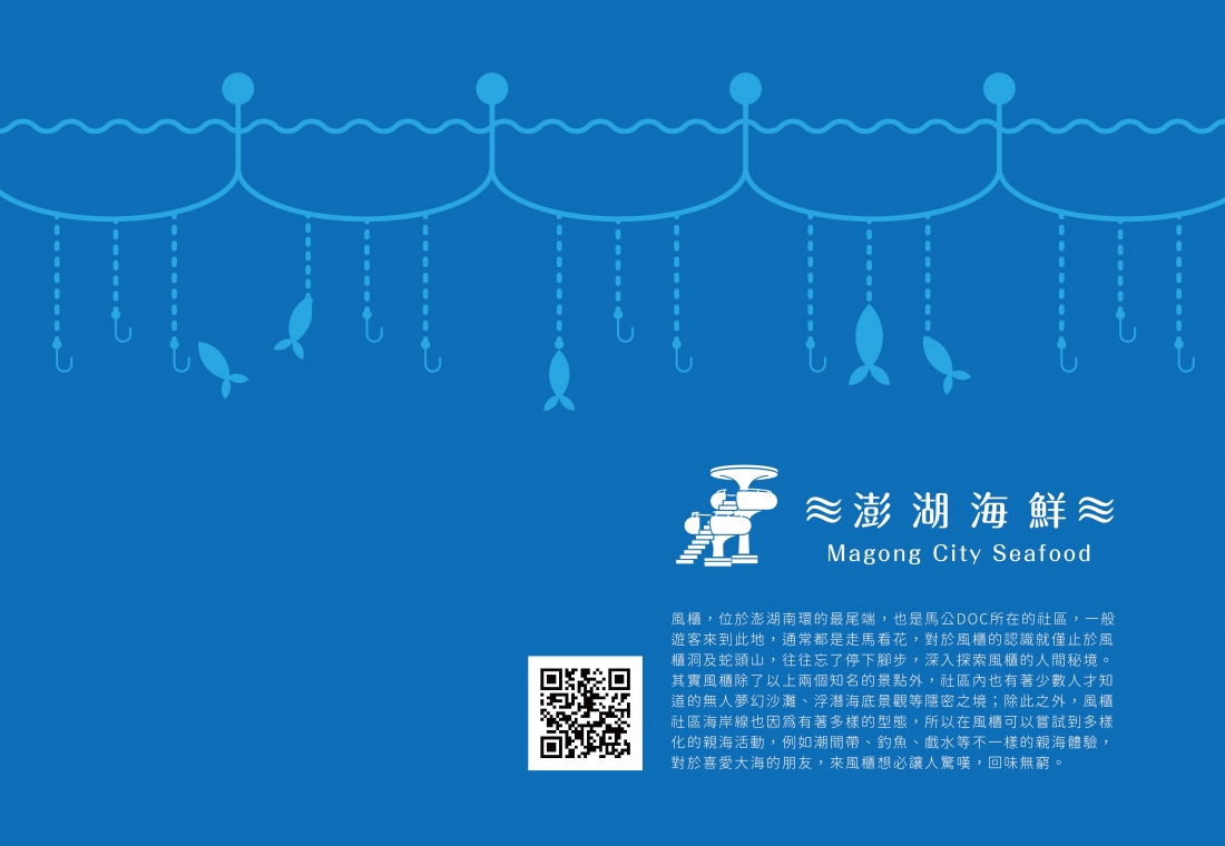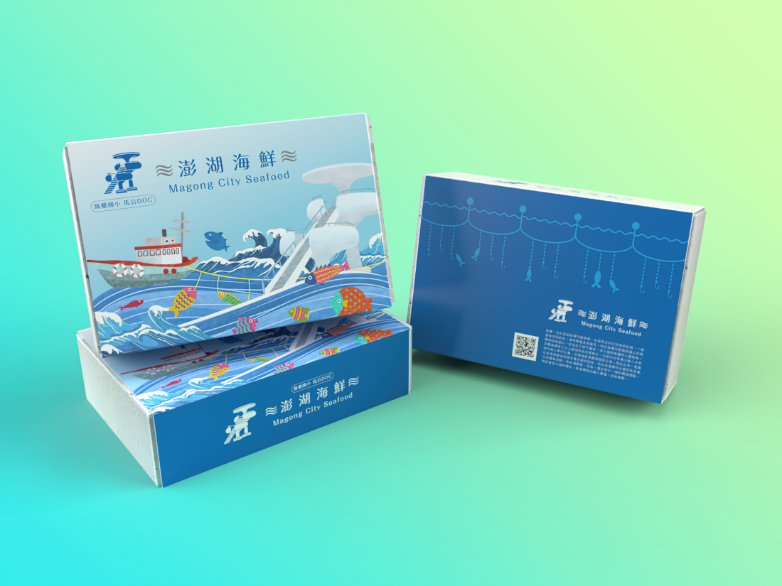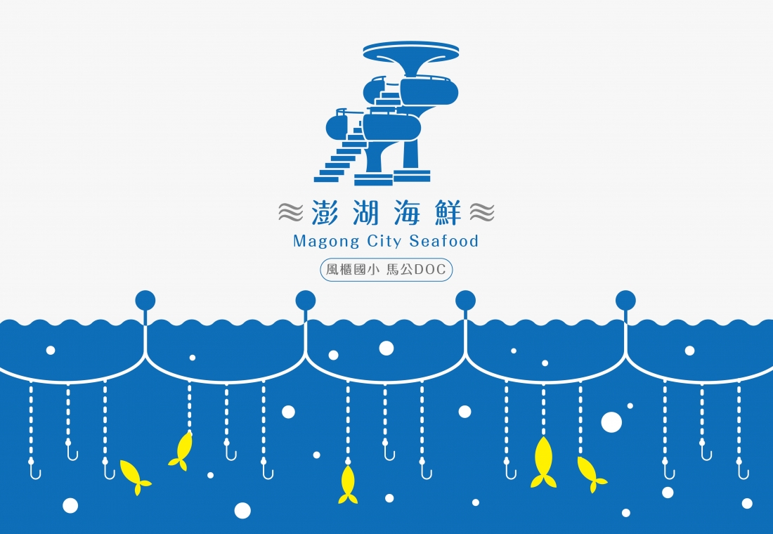 以澎湖海洋為核心意象,融合在地地標與漁船、魚群插畫,展現「新鮮、豐富、在地」的特色。清新的藍色調凸顯海鮮鮮度,搭配活潑的手繪風格,讓品牌同時具備專業感與親和力,傳遞「來自澎湖的海洋好味道」。