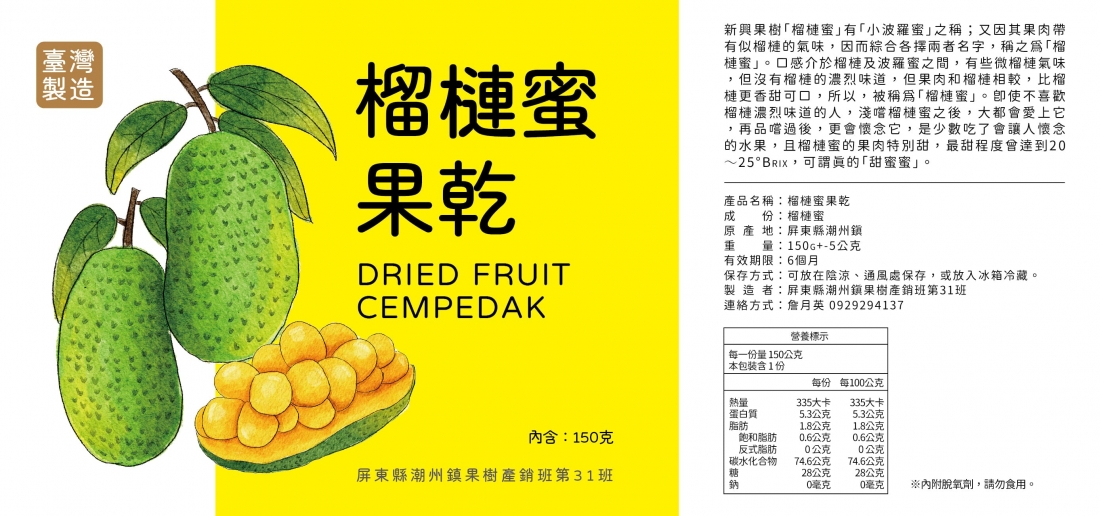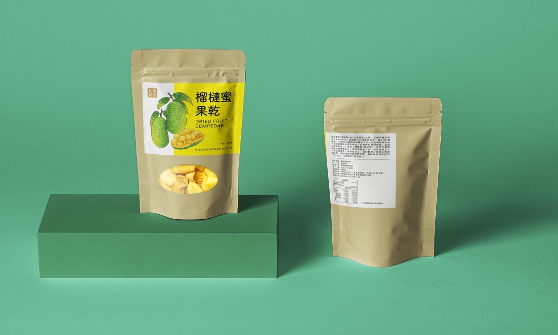 以鮮明的 黃色主色調 搭配水彩插畫的果實描繪,展現果乾的濃郁香甜與熱帶風情;版面清晰區隔圖像與文字,強調 臺灣製造、在地產地,營造自然健康又專業的形象,讓產品兼具伴手禮吸引力與食品資訊透明度。