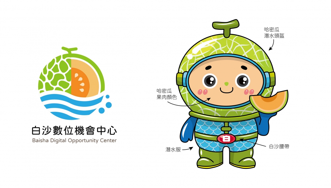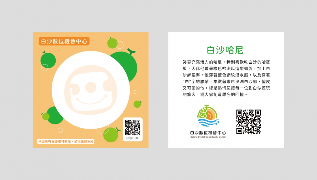 笑容充滿活力的哈尼,特別喜歡吃白沙的哈密瓜,因此他戴著綠色哈密瓜造型頭盔,加上白沙鄉臨海,他穿著藍色網紋潛水服,以及寫著"白"字的腰帶,象徵著來自澎湖白沙鄉,俏皮又可愛的他,總是熱情迎接每一位到白沙遊玩的旅客,為大家創造難忘的回憶。